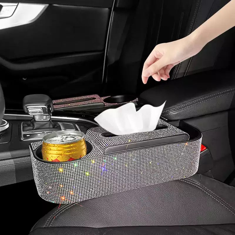 Multifunctional car accessory! Bling up your vehicle! This fits right inbetween the seat gap and is perfect for storing your phone, drink and tissues! Store anything you want in this sparkly car accessory! Comes in all colors!