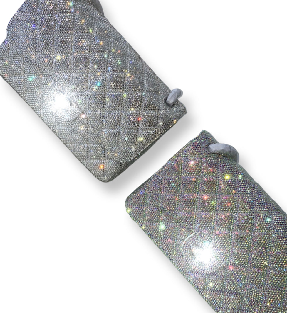 Crystalized purse! Comes with silver accents and your choice of stone color! This beauty is surrounded in stones, covered everywhere! Comes as a 12.5 inch size bag and let us bling it up!