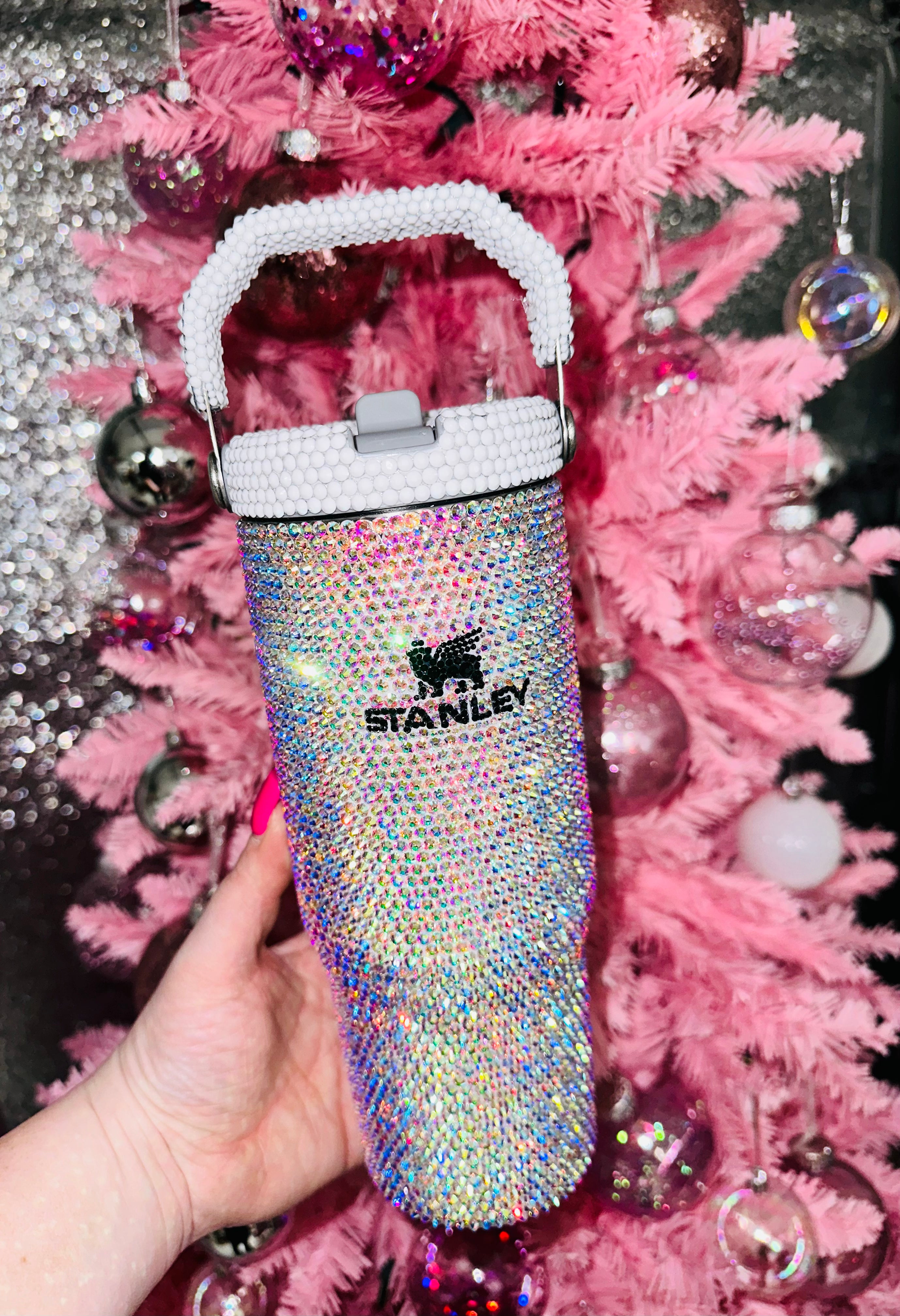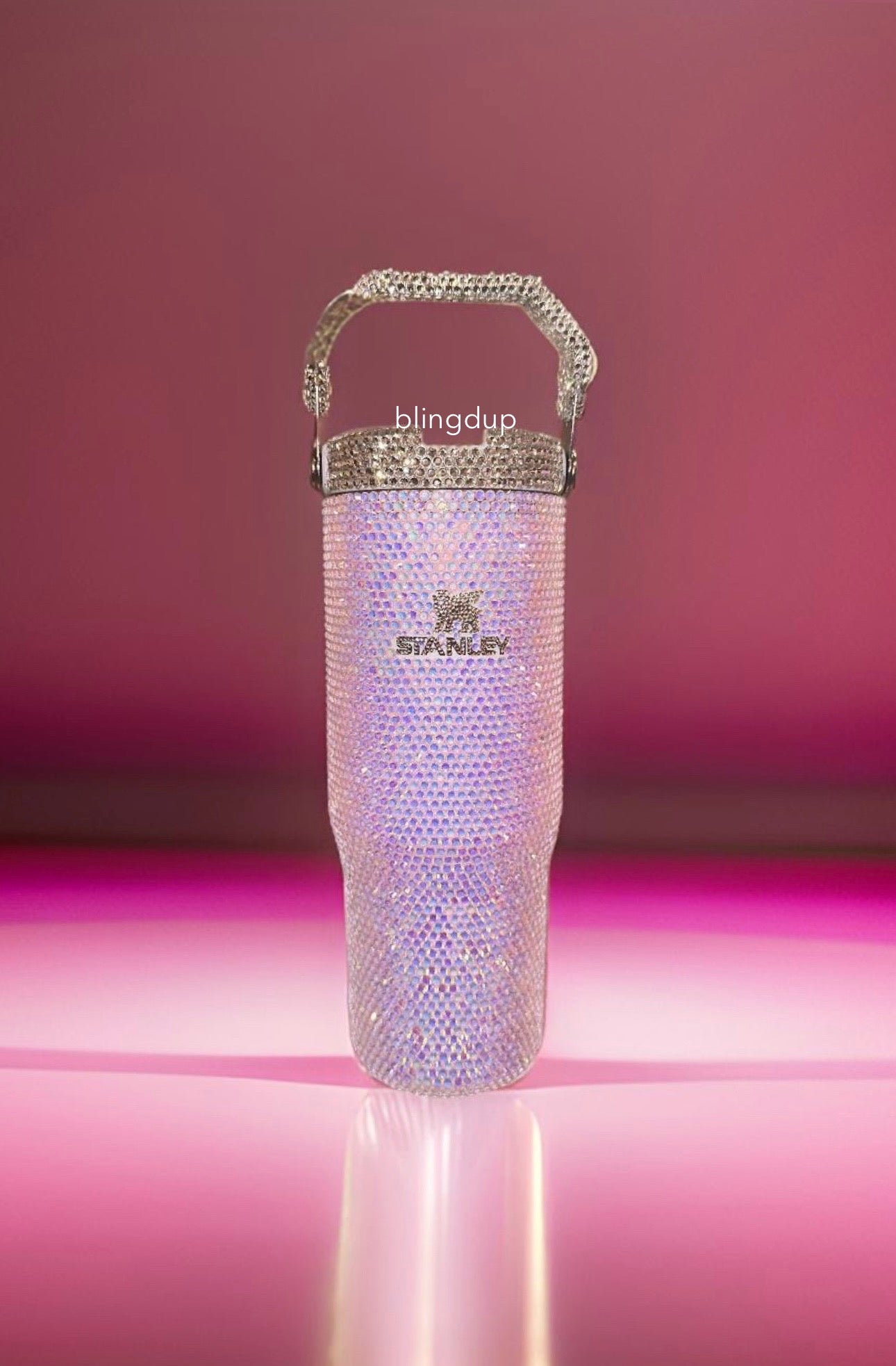 The newest edition to our crystal tumbler family! The top handle tumbler! Yes this tumbler comes with a top handle for easy carry and a slide open to close lid! Perfect for travel and getting your hydration in! Stainless steel keeps drinks hot or cold! Top handle is also covered in stones along with your choice of design and colors - we can do any image or design! YES ANYTHING! Enter your details above for customization!