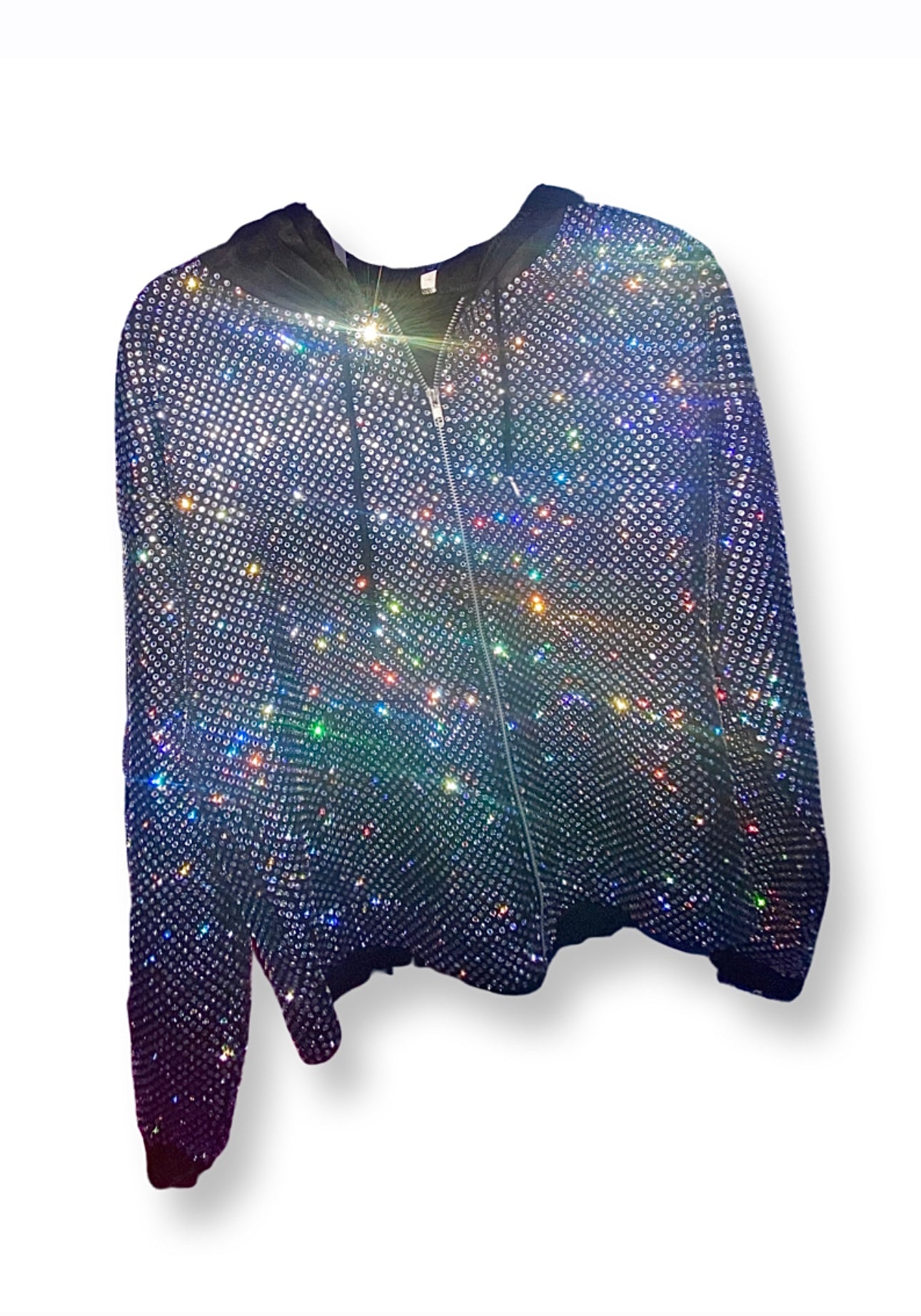 A statement piece for sure! Completely embellished with stones this super soft and comfortable jacket is made with thousands of glass stones. Super sparkly and definitely a unique piece! All done by hand and made to shine for a lifetime! True to size - for a fitted look, to be a bit roomy/baggy go one size up!
