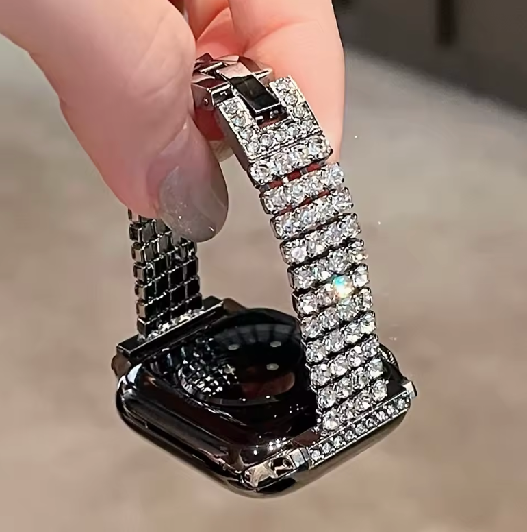 Elevate your Apple Watch with the Ice Link Crystal Band and matching case, featuring three dazzling rows of crystals for a striking, luxurious look. This elegant set not only enhances your style but also offers a coordinated cover to protect your device while keeping it glamorous. Perfect for those who want to shine every day with sophistication and sparkle.
