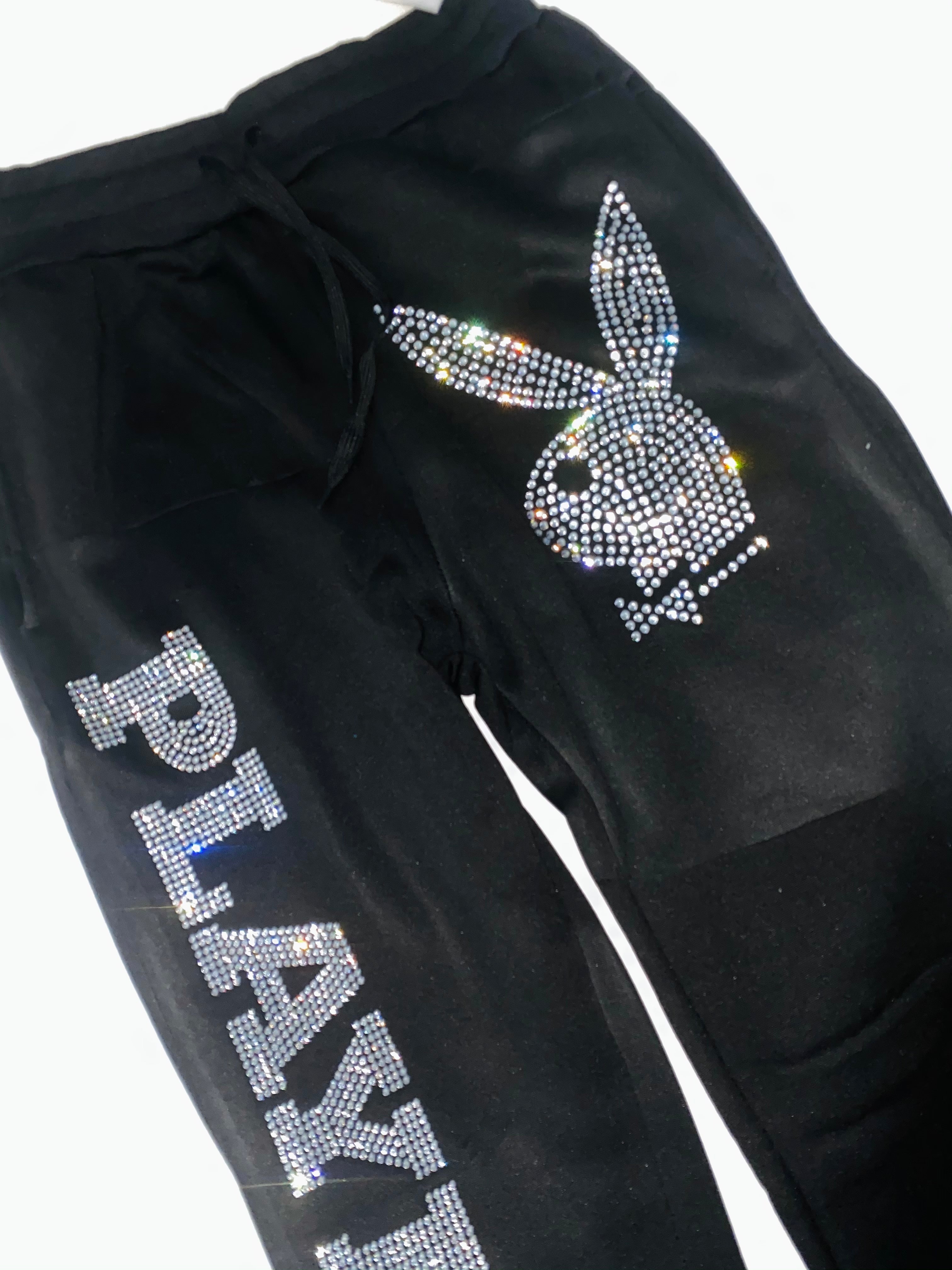 Step into luxury and style with our Crystal Bling Playboy Sweat Pants. These pants are crafted for comfort and adorned with sparkling crystals, featuring the iconic Playboy logo for a touch of sophistication. Perfect for lounging or casual outings, they combine fashion with comfort, making them a must-have addition to your wardrobe. Embrace effortless elegance with our Crystal Bling Playboy Sweat Pants and elevate your leisurewear to the next level.