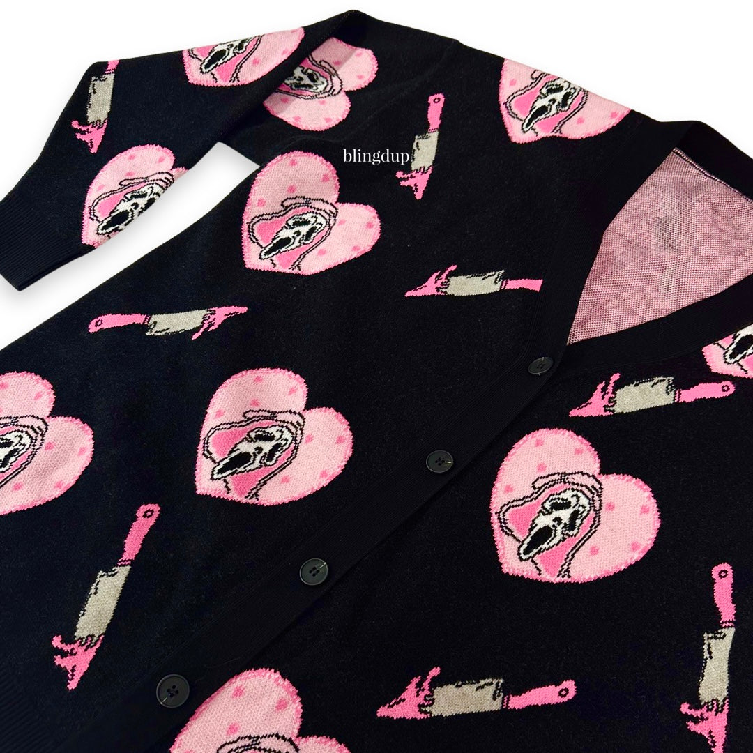The pink ghostie we all love! Cardigan with ghostface and his iconic dagger! Pink edition! True to size, has a loose feel and the softest cotton material!