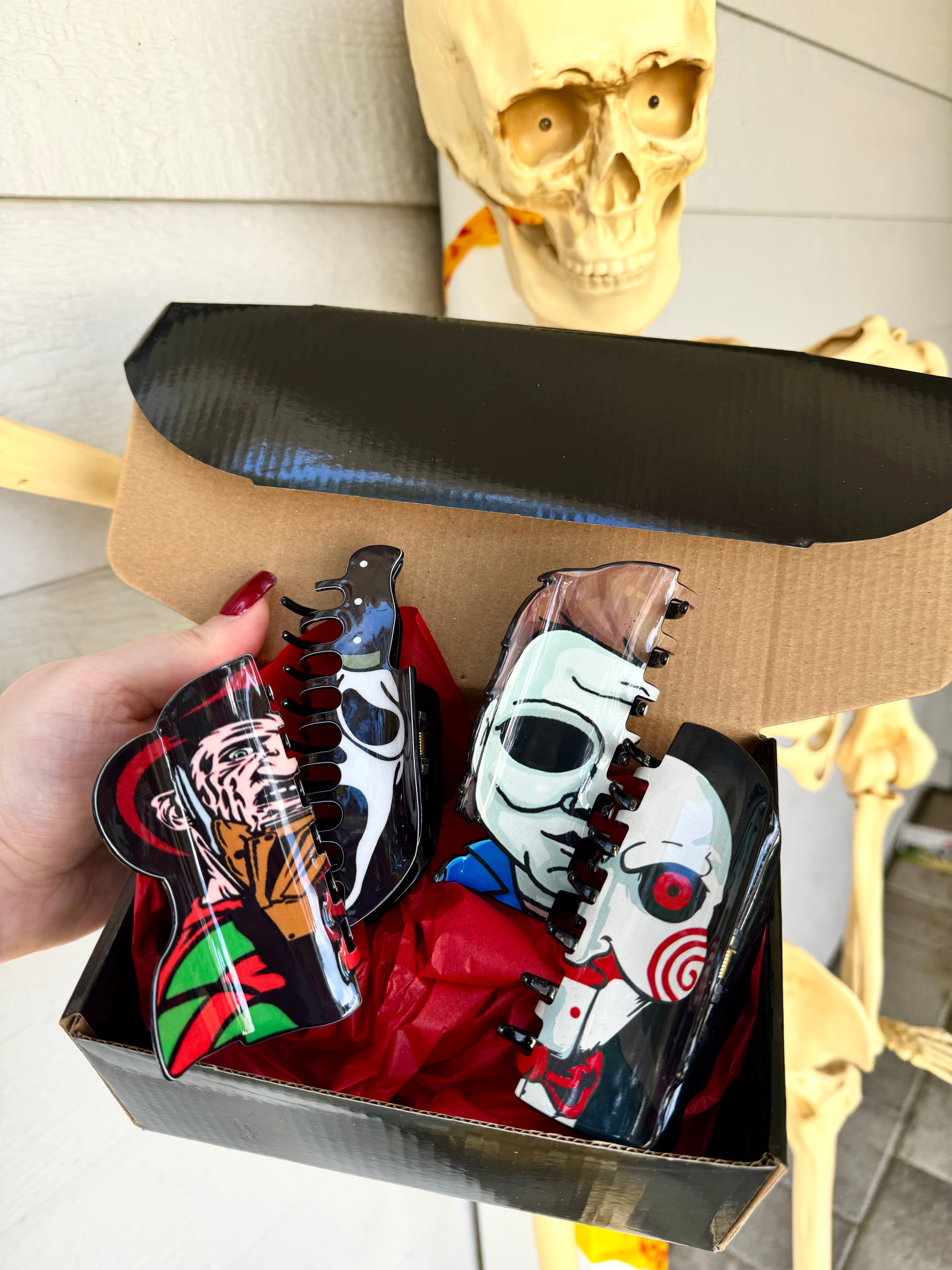 Get ready for a hair-raising Halloween with our Spooky Season Hair Clips! This bundle pack of four eerie and enchanting clips adds just the right touch of Halloween flair to any look. Each clip features a unique design inspired by classic Halloween villians - these clips are crafted to stay comfortably in place, keeping your style hauntingly flawless all day or night. Whether you’re dressing up for a Halloween bash or adding a subtle hint of spooky spirit to your everyday look, these clips are the perfect accessory.